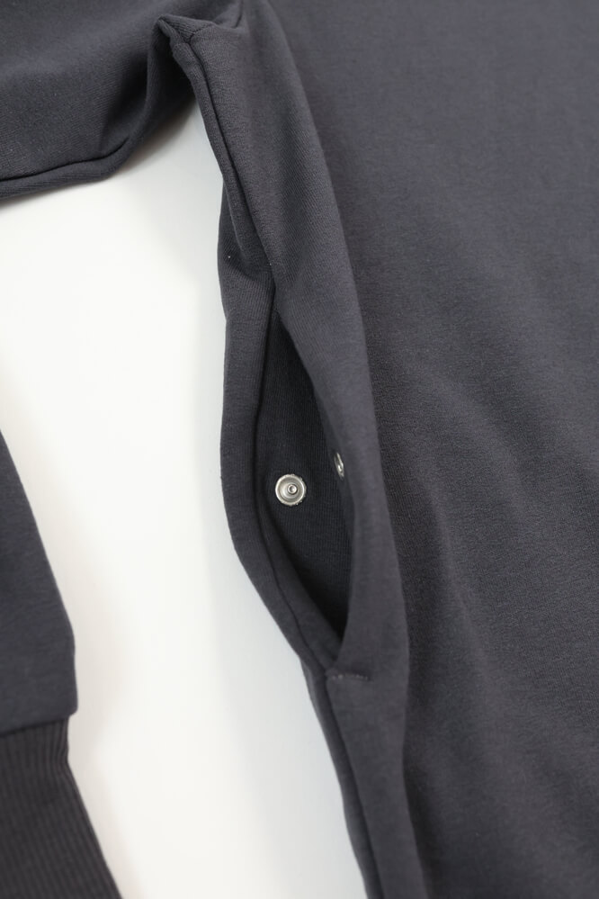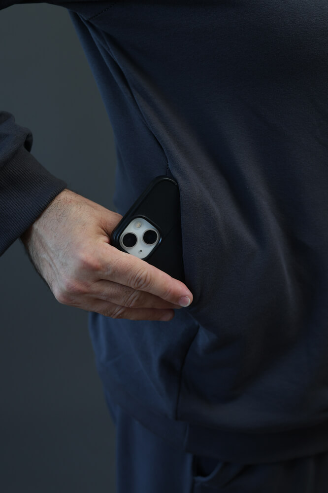 - Ukryta kieszeń na telefon zapinana na napę: Ukryta kieszeń boczna, zapinana na trwałą napę, jest idealna na telefon oraz inne drobne przedmioty, zapewniając im bezpieczeństwo i łatwy dostęp, przy zachowaniu minimalistycznego wyglądu bluzy. Kieszeń została wszyta w szwie z prawej strony, dzięki czemu jest niewidoczna na pierwszy rzut oka ale bardzo funkcjonalna. Koniec z wypchanymi kieszeniami w spodniach!